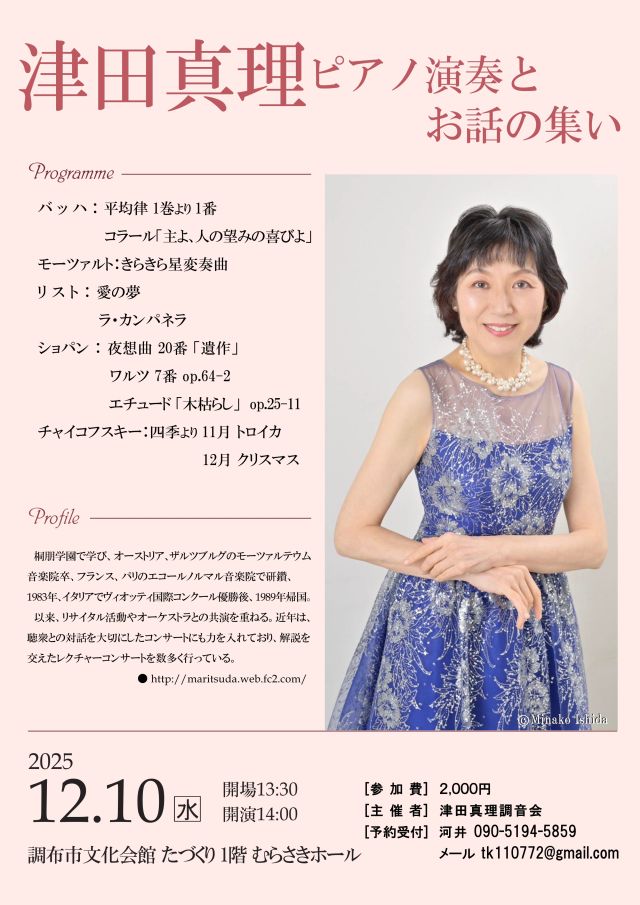12月という季節、クリスマスも意識したプログラムで、選りすぐりの名曲をお届けいたします。